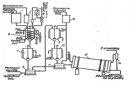 Рис.1. Схема установки периодического действия для получения адипиновой кислоты окислением циклогексанола азотной кислотой: 1-напорный мерник азотной кислоты; 2 – напорный мерник циклогексанола; 3 – каплеотбойник; 4 – холодильник; 5 – сепаратор; 6 - реактор окисления циклогексанола азотной кислотой; 7,10- кристаллизаторы, 8,11 – нутч-фильтры; 9 – растворитель; 12 – мерник деминерализованной воды; 13 – сушильный барабан; 14 – циклон.