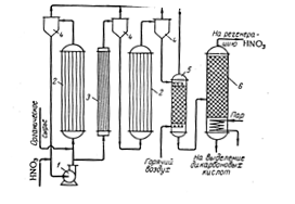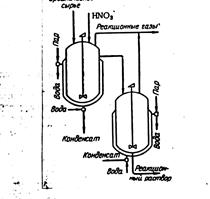 Выбор периодической или непрерывной схемы зависит в основном от требуемой производительности установки. В свою очередь, производительность определяется такими факторами, как способ отвода тепла реакции, время контактареагентов, необходимое для завершения процесса окисления, а также время, необходимое для выделения из реакционной смеси нитрозных газов.
