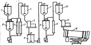 В данной схеме применены кристаллизаторы со взвешенным слоем кристаллов и с охлаждением раствора в выносных холодильниках. Вместо этих аппаратов с равным успехом можно использовать ивакуум -кристаллизаторы.