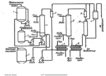 Рис. 6. Принципиальная схема отделения доокисления: 1-сборник органического сырья; 2 – сборник парового конденсата; 3- сборник азотной кислоты; 4 – реактор первой ступени; 5- сепаратор первой ступени; 6 – реактор второй ступени; 7 – подогреватель реакционного раствора; 8- подогреватель воздуха; 9- сепаратор второй ступени; 10 – колонна отдувки реакционных газов; 11- сепаратор-ловушка.