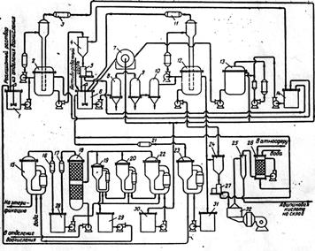 Рис. 7. Технологическая схема выделения адипиновой кислоты и регенерация азотной кислоты: 1-сборник реакционных растворов доокисления; 2- вакуум-кристаллизатор первого выделения; 3,11,16,17,21- конденсаторы; 4,24- декантаторы; 5,27 – центрифуги; 6- растворитель; 7 – вакуум-фильтр; 8- угольный фильтр, 9- катионитная колонна; 10- фильтр очистки от катионита; 12- вакуум-кристаллизатор перекристаллизации; 13-кристаллизатор дополнительного выделения адипиновой кислоты; 14,28,29, 30,31 – сборники; 15,23 – выпарные аппараты; 18 – ректификационная колонна; 19,20,22 – выпарная станция; 25- циклон; 26- мокрый скруббер; 32 – сушилка с кипящим слоем.