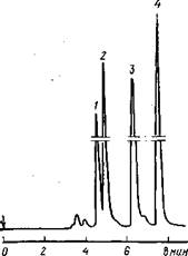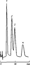 Рис. 1. Хроматограмма смеси аминных стабилизаторов полимеров, полученная на колонке размером 250x4,1 мм с силасорбом-600 (5 мкм), подвижная фаза — гексан — метиленхлорид — изопропанол — диэтил-амин (100:10:1:0,01 по объему), расход 1 мл/мин, детектор — УФ (254 нм), проба 2 мкл: 1 — фенил-β-нафтиламин; 2 — N-фенил-N’-изопропил-n-фенилендиамин; 3 — N-1,3-диметилбутил-N’-фенил-n-фенилендиамин; 4 — N,N'-бис(1,4-диметиламил-n-фенилендиамин)