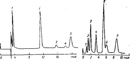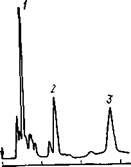 Рис. 2. Хроматограмма витаминов в пищевых продуктах, полученная на колонке размером 250x4 мм с нуклеосилом NH2 (10 мкм), подвижная фаза — гептан — хлороформ (80:20 по объему), расход 3,5 мл/мин, детектор—УФ (254 нм), проба 5 мкл: 1 — уксусный эфир витамина А; 2 — витамин Е; 3 — витамин Д3
