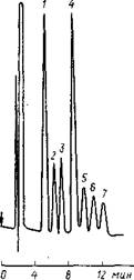 Рис. 3. Хроматограмма моносахаридов, полученная на колонке размером 250x4,6 мм с полигосилом 60 NH2 (5 мкм), подвижная фаза —ацетонитрил — вода (75:25 по объему), расход 2 мл/мин, детектор — УФ (190 нм): 1 — рамноза; 2 — ксилоза; 3 — арабиноза; 4 — фруктоза; 5 — манноза; 6 — глюкоза; 7 — галактоза