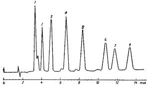 Рис. 7. Хроматограмма смеси ароматических углеводородов, полученная на колонке размером 250х4,6 мм с зорбаксом ОДС (6 мкм), подвижная фаза — метанол — вода (90:10 по объему), расход 1,5 мл/мин, детектор УФ (254 нм), проба 20 мкл: 1 — толуол; 2 — о -ксилол; 3 — трет -бутилбензол; 4 — n-трет -бутилтолуол; 5 — n-трет -амил-толуол; 6 — n-трет -гексилтолуол; 7 — 3,5-ди-трет -бутилтолуол; 8 — трет -гексил-о-ксилол