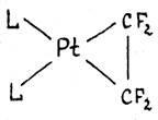 В комплексах c сильными электроотрицательными π-лигандами длины связей С-С приближаются к длине простой связи С-С в алканах. Например, в комплексе L2 Pt(C2 F4 ) длина связи С-С составляет 1.54 Ǻ, т.е. двойная связь по существу превращается в одинарную. Значения химсдвигов 19 Fи констант спин-спинового взаимодействия в спектре ЯМР комплекса также хорошо объясняются “циклопропановой” структурой.