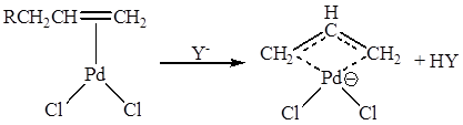 Поляризация молекулы олефина в π-комплексе может приводить к смещению электронов в группах, соседних с С=С – связью, что проявляется, например, в образовании π-аллильных комплексов: