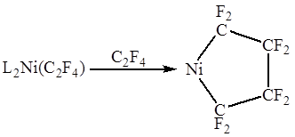 Т.о., взаимодействие сильного донора L2 Pt (0) с сильным акцептором C2 F4 приводит к существенному переносу d-электронов на π-лиганд и образованию металлоцикла. Происходит окислительное присоединение π-лиганда к Pt(0) с образованием Pt(II) и аниона C2 F4 2- .
