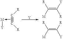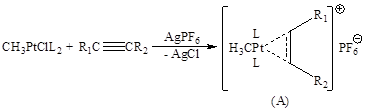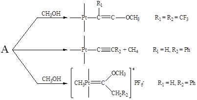 В ацетиленовых комплексах I типа (Ag(I), Cu(I), Hg(II), Pt(II), Pd(II), Ru(III) и др.) повышение электрофильности тройной связи приводит к облегчению взаимодействия с нуклеофильной частицей из раствора (транс- присоединение) или нуклеофилом, координированным металлом (цис -внедрение):