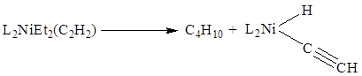 В π-комплексах II типа в первую очередь сильно разрыхляется тройная связь углерод-углерод и связь C-X при тройной связи. Так, активация связи С-Н в π-комплексах Ni(0), Pt(0), Os(0) или Rh(I) приводит к окислительному присоединению с образованием этинилгидридного комплекса металла: