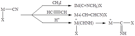 Для катализа особенно важны две последние реакции. Последняя реакция приводит к образованию изосинильной кислоты, способной внедряться по связи M-X.