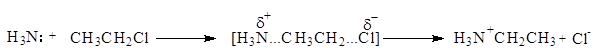 Аммонолиз галогенпроизводных относится к реакциям нуклеофильного замещения. В частности, реакция CH 3 CH 2 Cl + NH 3 протекает по механизму: