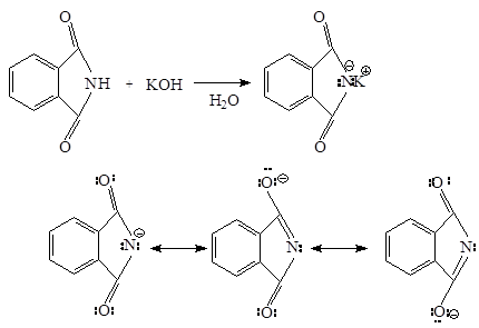 Фталимид обладает кислотными свойствами из-за делокализации отрицательного заряда имид-аниона на двух ацильных атомах кислорода. Он теряет протон, связанный с азотом, при взаимодействии с основанием типа гидроксида калия. В результате этой реакции образуется фталимид-ион – анион, который стабилизируется: