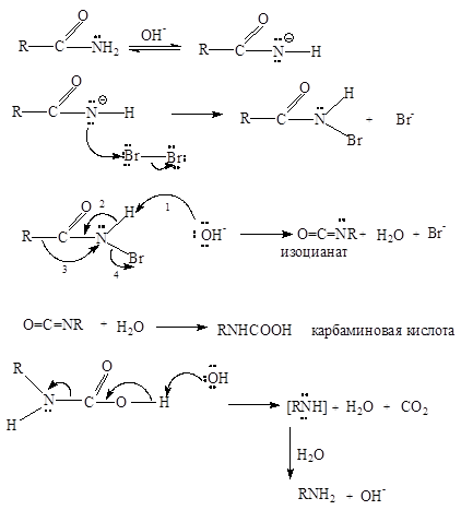 Амиды алифатических и ароматических карбоновых кислот реагируют со щелочными растворами иода, брома или хлора с образованием первичных аминов. Это так называемая гипогалогенитная реакция Гофмана позволяет не только синтезировать первичные амины, но и укорачивать углеродную цепь на один атом.