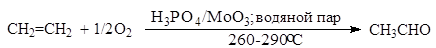 При окислении этилена кислородом в присутствии триоксида молибдена и фосфорной кислоты сначала образуется окись этилена, но она немедленно изомеризуется в уксусный альдегид. Для уменьшения времени контакта, и предотвращения дальнейшего окисления ацетальдегида одновременно пропускают водяной пар.