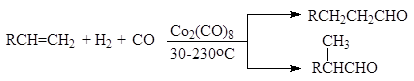 При температуре от 30 до 250 оС и давлении 100-400 атм в присутствии дикобальтоктакарбонила алкены присоединяют водород и монооксид углерода с образованием альдегидов. Обычно получается смесь изомеров:
