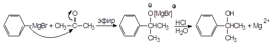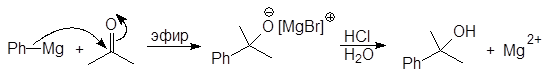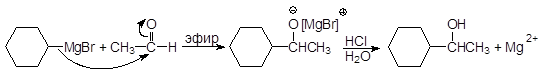 Особая ценность реактивов Гриньяра заключается в их способности создавать новые связи С¾С. Разница в электроотрицательности между углеродом и магнием (2,5 - 1,2 = 1,3), обусловливает полярность связи между этими атомами и наличие частичного отрицательного заряда на атоме углерода и частичного положительно-го заряда на атоме магния. В реакциях реактивы Гриньяра ведут себя как карбанионы. Карбанионы являются хорошими нуклеофилами и легко присоединяются к карбонильной группе. Магнийорганические соединения вступают в реакции нуклеофильного присоединения к альдегидам и кетонам с образованием алкоксидов, гидролизующихся в спирты: