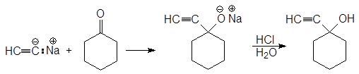 Этинид-анион также является нуклеофилом. Образующиеся при этом спирты содержат две функциональные группы, каждая из которых может быть далее модифицирована.