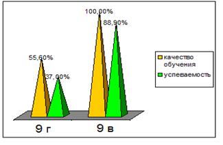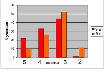 Для констатации результата после проведения разработанных занятий были проведены контрольные работы, состоящие из тестов, которые приведены в главе III. Результаты эксперимента в школе приведены в диаграммах, отражающих изменения качества знаний и успеваемости в контрольном (9 г) и экспериментальном (9 в) классах.