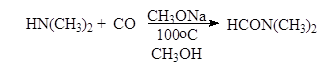 Формамид представляет собой бесцветную жидкость (Т.кип. 210,7 О С) и используется как растворитель. Один из важнейших биполярных апротонных растворителей N,N-диметилформамид (ДМФА, Т.кип. 152 о С) получают из диметиламина и окиси углерода через метилформиат: