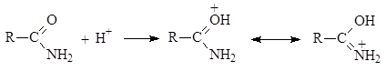 В отличие от аминов амиды являются лишь слабыми основаниями. Это обусловлено сопряжением электронной пары атома азота с карбонильой группой.