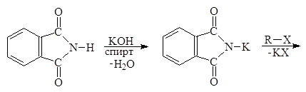 Имид, чаще всего фталимид, превращают в калиевую соль действием спиртового раствора KOH; обработка этой соли алкилгалогенидом дает N-алкилфталимид, гидролиз которого приводит к образованию первичного амина и фталата калия: