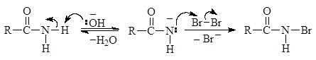 На первом этапе происходит бромирование амидов в щелочной среде:
