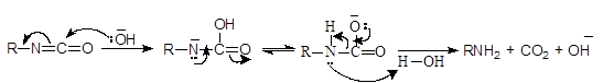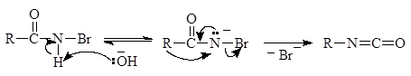 На второй стадии щелочь отщепляет протон и образуется анион N-бромамида изомеризующийся в изоцианат: