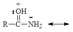 Атом азота в амидах настолько слабо основен, что их протонизация проходит по атому кислорода несмотря на его большую электроотрицательность, чем азот. Протонизированный по кислороду амид стабилизируется за счет резонанса: