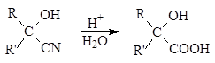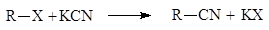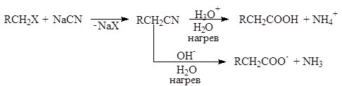 Нитрилы, получаемые из алкилгалогенидов и цианидов металлов по реакции нуклеофильного замещения, являются хорошими исходными продуктами для получения карбоновых кислот. Для этого их подвергают гидролизу в присутствии кислот или оснований: