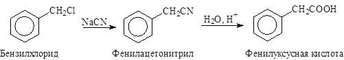 По этой схеме из доступного бензилхлорида получают фенилуксусную кислоту: