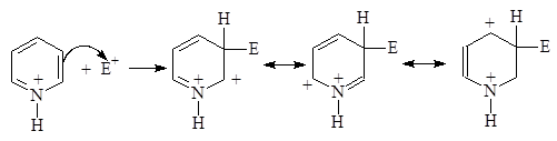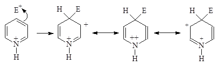 Возникающий пиридиний - катион чрезвычайно нереакционноспособен по отношению к электрофильным реагентам из-за своего положительного заряда на атоме азота.
