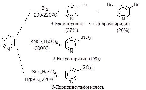Реакции электрофильного замещения с пиридином проходят сложнее, чем с бензолом, так как атом азота дезактивирует ароматическое ядро.