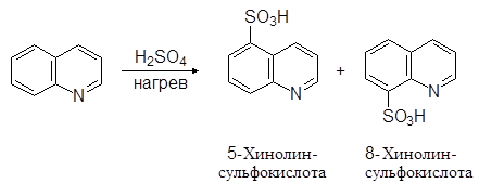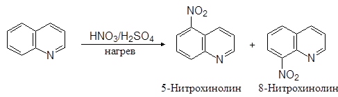 По свойствам хинолин очень напоминает пиридин. Он вступает в реакции электрофильного замещения. Эти реакции протекают легче чем в случае пиридина и осуществляются по бензольному кольцу: