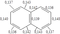 Таким образом, было установлено, что оба кольца являются бензольными. Согласно экспериментальным данным нафталин по своим свойствам относится к ароматическим соединениям. С теоретической точки зрения нафталин имеет структуру, необходимую для того, чтобы быть ароматическим соединением: он содержит плоские шестичленные кольца и рассмотрение атомных орбиталей показывает, что его структура допускает образование p-облаков, содержащих 6 электронов - ароматический секстет. Десять атомов углерода расположены по углам двух сочлененных шестиугольников. Каждый атом углерода связан с тремя другими атомами s-связями. Поскольку они образуются при перекрывании тригональных sp2 -орбиталей, то все атомы углерода и водорода лежат в одной плоскости. Выше и ниже этой плоскости находится p облако, образующееся в результате перекрывания р-орбиталей, имеющее форму восьмерки. Рентгеноструктурный анализ показал, что в нафталине длина С-С связей различна. Энергия сопряжения 61 ккал/моль.