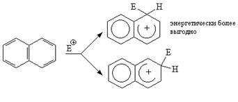 Следует отметить, что связи 1,2 более похожи на двойные, чем 2,3. Связи 1,2 и 3,4 в нафталине в некоторой степени аналогичны сопряженной системе в 1,3-бутадиене. Это находит отражение как в определенной активности a-положений к электрофильным реагентам, так и в реакциях присоединения, характерных для диеновых углеводородов. При вступлении электрофильного реагента в a-положение возникающий промежуточный s-комплекс более энергетически выгоден в сравнении с s-комплексом, образующимся при атаке b-положения.
