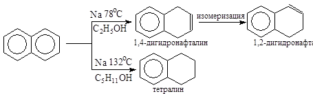Реакции присоединения к нафталину протекают легче, чем в случае бензола. Восстановление нафталина осуществляется обычными восстановителями