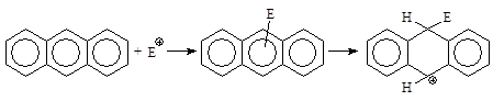 Реакция электрофильного замещения протекает в положение 9, 10 по обычному двухстадийному механизму. Но как правило реакция присоединения