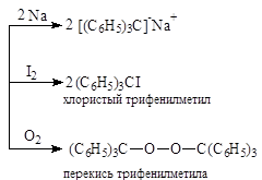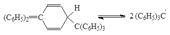 Фактически с O2, I2 и Na взаимодействуют не ГФЭ, а именно радикал трифенилметил. Для диссоциации СН3-СН3 требуется 85 ккал/моль, а для (С6Н5)3С-С(С6Н5)3 необходимо всего 12 ккал/моль. Причина понижения энергетического уровня связаны с высокой устойчивостью (С6Н5)3С, которая вызвана тем, что неспаренный электрон не концентрируется на атоме углерода, а рассредоточен по всем бензольным ядрам благодаря сопряжению. Эта причина устойчивости радикала - главная. Однако есть и вторая - рекомбинация радикалов препятствуют пространственные затруднения.