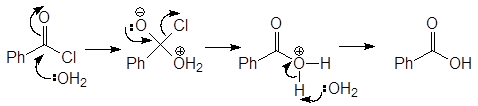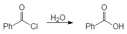 С водой они реагируют так энергично, что их нужно хранить без доступа влаги.Например, гидролиз бензоилхлорида