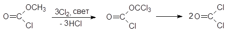 Метиловый эфир хлормуравьиной кислоты может быть прохлорирован до трихлорметилового эфира хлормуравьиной кислоты (дифосгена):