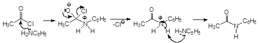 Упр.14. Напишите реакции (а) ацетилхлорида и (б) бензоилхлорида с анилином в избытке и опишите их механизм.