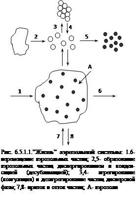 Концентрация и размер частиц дисперсной фазы аэрозолей все время изменяются: частицы возникают и исчезают, укрупняются и дробятся на более мелкие, перемещаются - какая-то часть частиц аэрозольной системы покидают ее, что компенсируется за счет притока новых частиц (см. рис. 6.5.1.1).