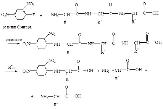 Белки, как и прочие амиды гидролизуются под действием кислот и щелочей. После полного гидролиза можно установить качественный и количественный аминокислотный состав, но не точную последовательность аминокислот. Если перед гидролизом обработать полипептид реактивом Сэнгера, то можно будет затем идентифицировать N-концевую аминокислоту, так как она даст устойчивое окрашенное производное анилина, которое не разрушается при гидролизе.