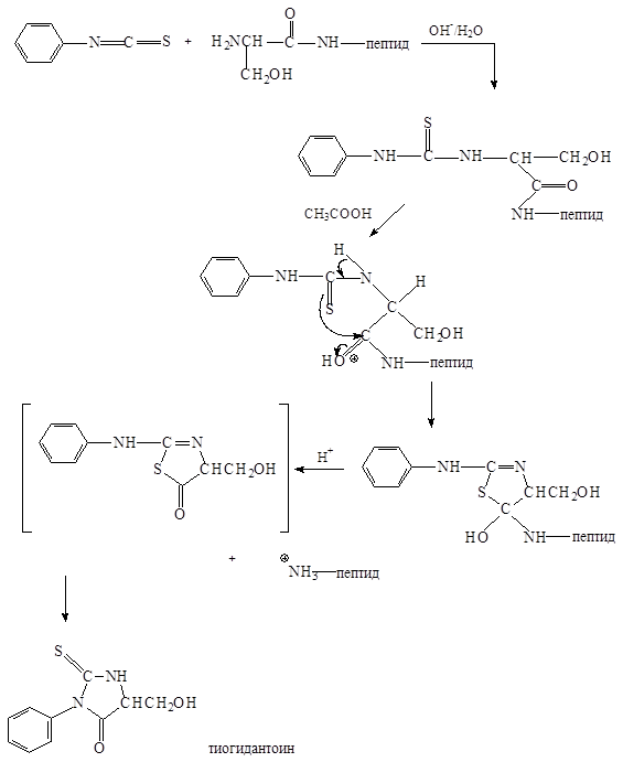 В результате реакции фенилизотиоцианата с N-концевой аминокислотой образуется аддукт (тиомочевина), который циклизуется в уксусной кислоте. При кислотном гидролизе аддукт расщепляется, давая N-концевую аминокислоту и неустойчивое промежуточное соединение, которое изомеризуется в тиогидантоин. Специфический тиогидантоин служит для идентификации первой N-концевой аминокислоты. Проводя во второй раз всю последовательность реакций, можно определить следующую аминокислоту, так как она стала N-концевой в результате деградации по Эдману.