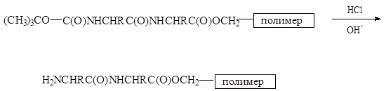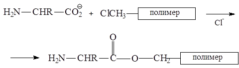 Для синтеза белков стали применять метод, впервые предложенный Р. Меррифилдом и получивший название твердофазного синтеза пептидов (ТФСП ). На первой стадии синтеза аминокислоту, которая будет стоять на С-конце будущего белка, присоединяют через ее карбоксильную группу к полимеру. При этом нередко используют образование эфирной связи между этой группой и хлорметильной группой полимера: