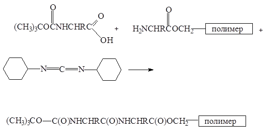 Затем проводят ацилирование свободной аминогруппы этой аминокислоты путем реакции с дициклогексилкарбодиимидом и другой аминокислотой, которая содержит защищенную аминогруппу. В результате образуется первая пептидная связь:
