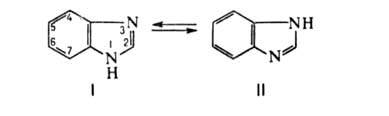 Бензимидазол, мол. м. 118; бесцветные кристаллы, т. пл. 172°С; растворим в воде, спиртах, разбавленных кислотах и щелочах, трудно растворим – в неполярных растворителях. Молекулы ассоциированы благодаря водородной связи — NH...NH=. Положения 4 и 7, а также 5 и 6 равноценны вследствие равновесия между таутомерами I и II: