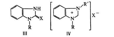 С ионами некоторых металлов (Ag, Co, Си и др.) бензимидазол образует в аммиачном р-ре соли. Бензимидазол устойчив к действию окислителей, но СrO3 в 80%-ной H2 SO4 при 80°С окисляет его до имидазол-4,5-дикарбоновой к-ты. Сплавление с S превращает бензимидазол в бензимидазол-2-тион, 1-алкилбензимидазолы - в его 1-алкилзамещенные (формула III, X = S, R = А1К). Б. алкилируется алкилгалогенидами и диалкилсульфатами в присут. щелочей в положение 1. При алкилировании N-алкилбензимидазолов образуются соли 1,3-диалкилбензимидазолия (формула IV). Арилирование бензимидазола в положение 1 с помощью галогенаренов протекает обычно в жестких условиях. Действием ацилхлоридов и ангидридов кислот получают N-ацилпроизводные. Бензимидазол нитруется смесью HNO3 и H2 SO4 в положение 5. При сульфировании образуется 5(6)-сульфокислота. Нуклеофильное замещение протекает в положении 2 лишь с N-производными Б. При нагревании с NaNH2 в диметиланилине образуются 2-аминопроизводные Б., при сплавлении с КОН-бензимидазолоны (ф-ла III, X = О). Металлирование (например, фенилнатрием) идет в положение 2.