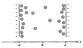 Для простоты ограничим математическое описание двумя плоскими заряженными поверхностями, находящимися друг от друга на расстоянии 2а. Примем, что заряд равномерно распределен по поверхностям, т.е. плотность заряда у одинакова. Согласно результатам моделирования, такую систему можно считать достаточно хорошим приближением. Кроме того, для упрощения примем, что в системе присутствуют только противоионы, способные нейтрализовать заряд поверхностей. Случай с присутствием других солей обсудим позже.